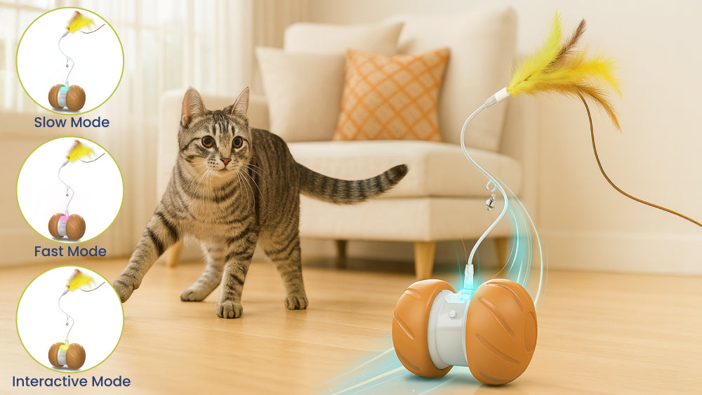 Choose from Slow (Blue), Fast (Purple), or Interactive (Yellow) modes to match your cat’s energy and play style.