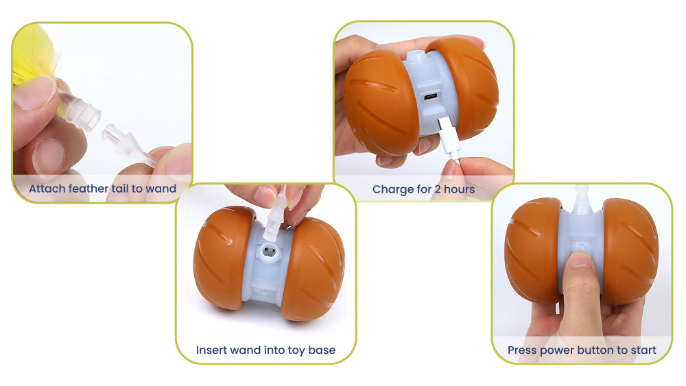 This USB rechargeable cat toy fully charges in about 2 hours. A full charge provides extended playtime, and the toy automatically enters standby mode after 5 minutes of inactivity to save battery power.
