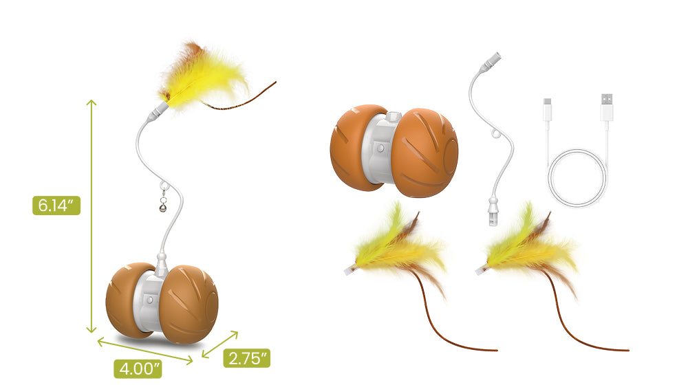 Compact size 4 × 2.75 × 6.14 inches, designed for easy indoor play. The box includes the main toy, accessory rod, two feather tails, bell, charging cable.