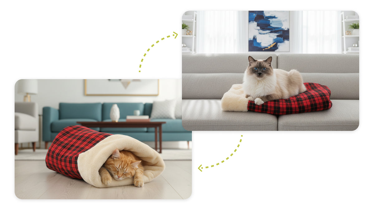Transforms easily to suit your cat’s mood—whether they want to hide, lounge, or curl up in warmth.